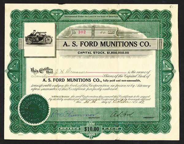 Delaware. 40 Shrs Stock Certificate. Issued. Tri-wheeled motorcycle with machine gun mount. Very Fine. Rare and first time offered by us. (Ex-John E. Herzog Collection).