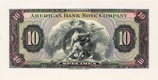 ND (ca. 1920-1940's), Ò10Ó denomination proof note printed on india paper mounted on large card, allegorical figures ÒWheel of ProgressÓ surrounded by intricate lathe work, Choice to Gem Uncirculated condition, ABNC.