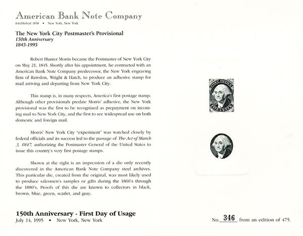 NY. With Proofs of Entire Stamp and Vignette. 150 Anniversary NYC Postmaster's Provisional Barr-SO-138, Card # 346 from and edition of 475, Mint, ABNC.