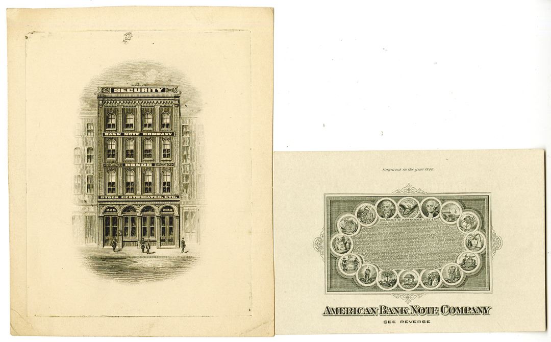 New York and Pennsylvania, Lot of 2 items, Includes ca. 1900 American Bank Note Company Business card with information about their products on one side and a well known, ca.1840 engraved Declaration of Independence surrounded by images of the different states arms; also included is a ca.1900 proof vignette of the SBNC building in Philadelphia. Both items are intaglio printed and in uncirculated condition. ABNC & SBNC (2). (John E. Herzog Collection)