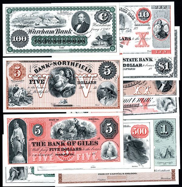 ABNC, Obsolete Banknote Collection from 36 different issuing entities, Include Miners Bank of Savings, California; Commercial and Agricultural Bank, Galveston, Texas and dozens of other interesting and attractive notes, all in mint condition, printed on thin white card stock with American Bank Note Commemoratives attestation. ABNC.