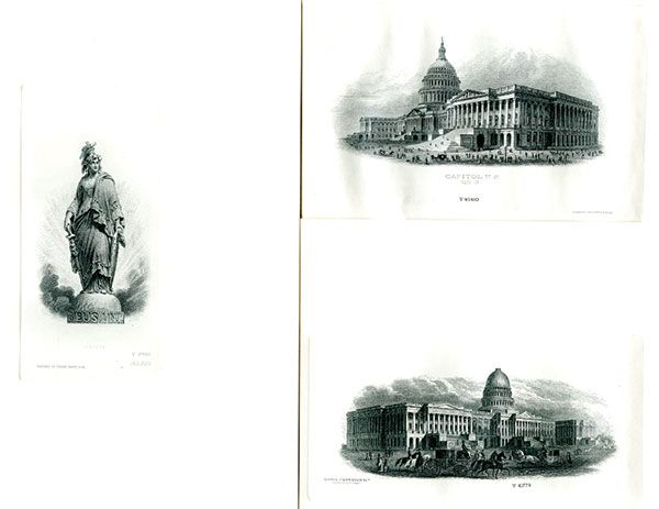 Lot of 3 pieces, Includes 2 different view of the U.S. Capital, one by National BNC and the second by TCC and a third LDPP of Standing Liberty, All signed on back by printer and possibly Spider proofs, Used for various 1996 A.P.S. cards.