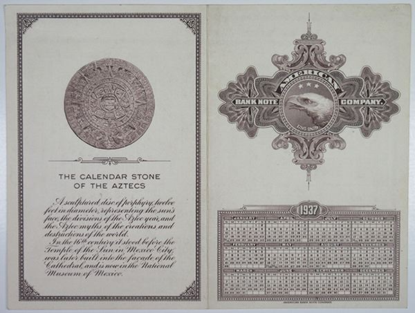 American Bank Note Co., Brown. ABNC eagle logo on front and the Mexican "Aztec Calendar Stone" on the back. There is a small calendar on the front for 1937. XF to AU condition. ABNC Scarce brown color.