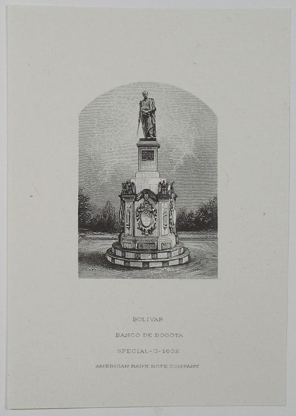 Colombia. 1919, Proof vignette of Bolivar monument used on the back of the 1919 Banco De Bogota series, 1; 5 and 10 Pesos, P-S297 to S299, Printed in Black on india paper that is unmounted, 2.75 x 3.75 inch. "Bolivar, Banco de Bogota, Special - C-1602" imprint on bottom. Printed by ABNC.
