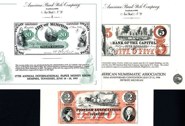 Lot of 3 cards, All with similar color shift errors, Includes, 1994, Bank of the Capital Obsolete, ANA 103rd Anniv. Detroit, MI, Barr-SO 129 Unlisted; 1993, City of Memphis obsolete, 17th Annual Int'l IPMS, June 1993, Barr-SO 115 Unlisted; and 1994, Pioneer Association Obsolete, CSNS 55th Anniv. Conv., April 1994, Indianapolis, IN, Barr-SO 127 Unlisted, All Mint. ABNC.
