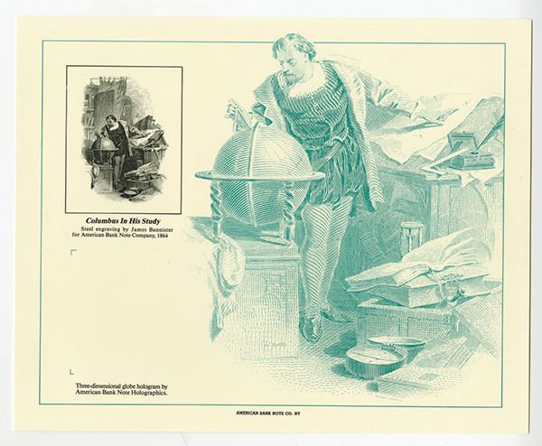 Columbus in His Study, intaglio steel engraving by James Bannister for ABNC 1864, all are Mint condition. All are missing the hologram on the lower left corner. ABNC. (43)