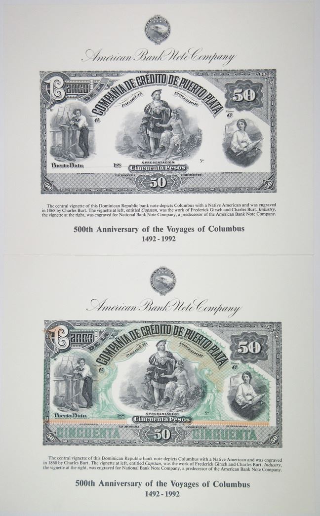 Dominican Republic. Pair of Progress Proofs. 1 in black and white and the other in full color with the color out of proper registration. The central vignette of the Dominican Republic bank note depicts Columbus with a Native American and was engraved in 1968 by Charles Burt. The vignette at left, entitled "Capstan" was the work of Frederick Girsch and Charles Burt. "Industry" the vignette at the right, was engraved for National Bank Note Company, a predecessor of the American Bank Note Company. (2)