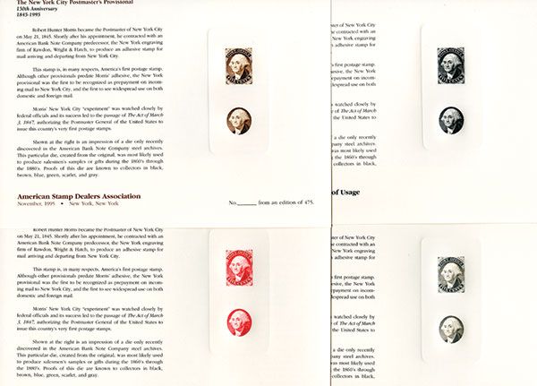 Milwaukee, Wisconsin, 1995, Lot of 4 different cards, each in different colors with completely printed proof of the Provisional stamp as well as the vignette by itself of George Washington, Colors include red (Milwaukee); brown (New York); gray (Anaheim, CA) and black (New York), Impressive looking proofs, all mint. Additionally, 2 have printed at bottom “No.____ From an edition of 475”. ABNC. Barr-SO 138-143.