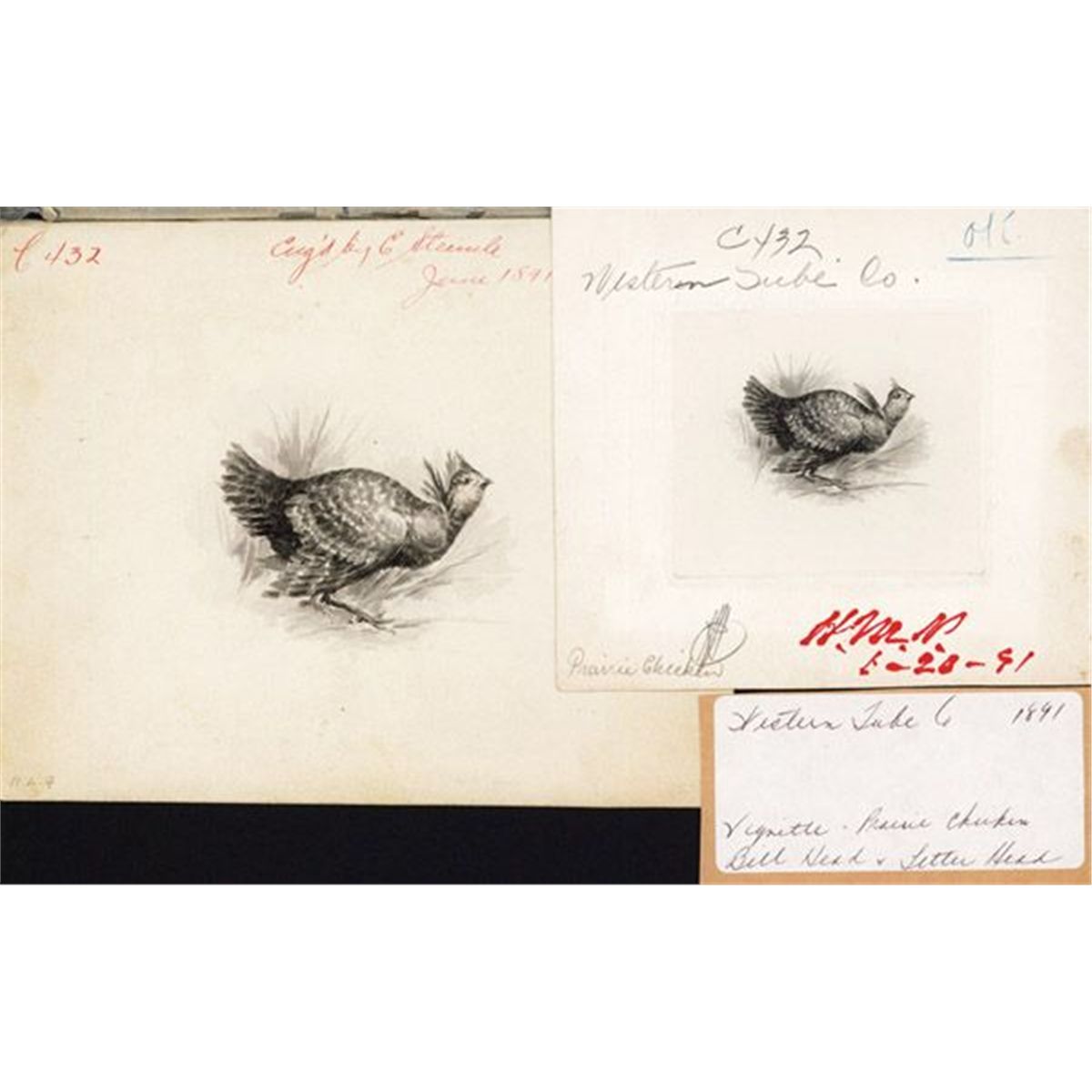 1891, Lot of 2 items for Western Tube Company, Includes Complete Large Die Proof engraving of Prairie Chicken printed on india paper on large card with approval signatures and artists initials on bottom left, Also included is original artwork in watercolor of Chicken with Initials on lower left “W.L.G.” which I assume are the artist's initials as well text on top “Engraved by E. Steinck - June 1891”, The sketch had an overlay with corrections which is mostly missing now. Unique artwork from ABNC.
