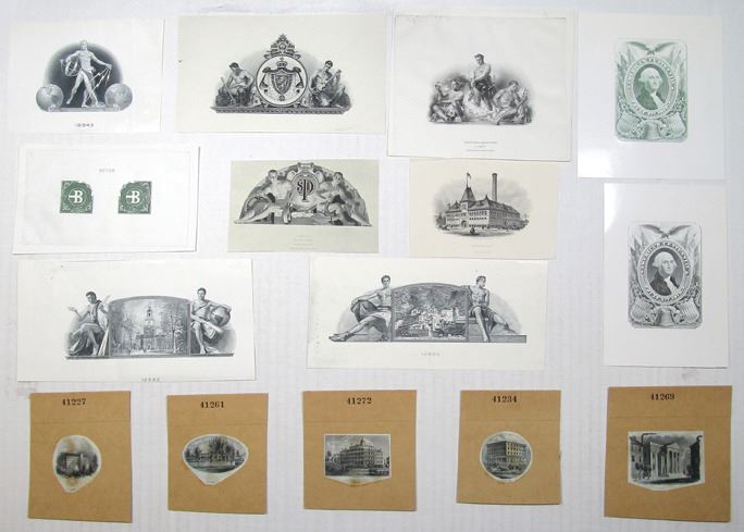 New York and Pennsylvania, ND 1840s-1960s. Lot of 15 Proof Vignettes, Highlights Includes: Large building by river; "Augusta House"; Home with colonnade; Home with picket fence; Building surrounded by trees; Stylized "B"; "Murphy Varnish"; "Works at Chicago" ; "Independence Hall" in Philadelphia; playing card back designs in different colors with George Washington at center and more. Vignettes range from VF to XF condition. (15). Sold "AS IS" no returns accepted.