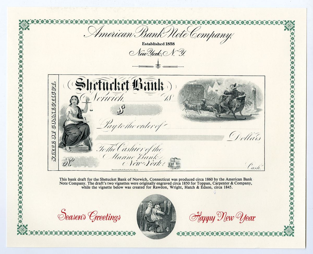ABNC Bank Draft for the Shetucket Bank of Norwich Connecticut with Santa Claus Vignette ca.1860 Seas