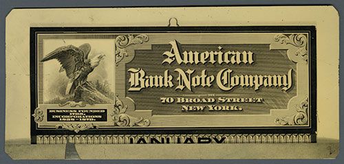 New York, ND (ca. 1880-90's), 11 x 5 inches, Screaming eagle on left, 70 Broad Street address listed. Appears XF but a small chip of the photograph has fallen off the bottom left border just touching design, still a unique piece of ABN Security Printing advertising.