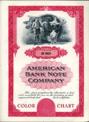 Color sample book with 30 pages of different colors. Each page has Stock or bond certificate style borders with small corporate seal on bottom and large vignette of 3 allegorical women and one allegorical man in front of large industrial gear. Leather type of cover. Pristine condition. Dated 1979 in purple on inner cover. "Property of American Bank Note Co."" in gold on front. Scarce. ABNC.