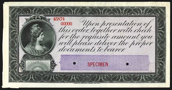 Security form from ABNC, Liberty at left. Printed on both sides. Formerly mounted, old page at left edge on back. Top paper edge issues at corners. Very Fine to Extremely Fine.