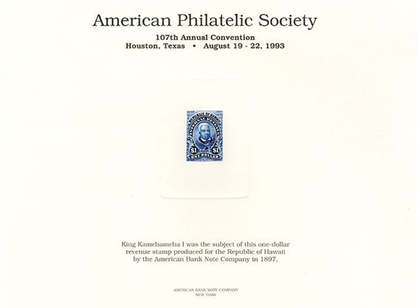 APS, 107th Annual Convention. Houston, Texas, 1993, Untrimmed card, Barr - SO/119. Uncut card with blue 1897 Hawaiian stamp impression. Mint condition.