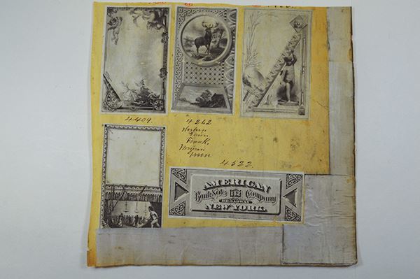 New York, ND, ca. 1860's, Backs for advertising cards and ABNC 142 Broadway address design. 5 pieces mounted on ledger book page. Re-enforced tape on two edges, affecting one design. Dirty.