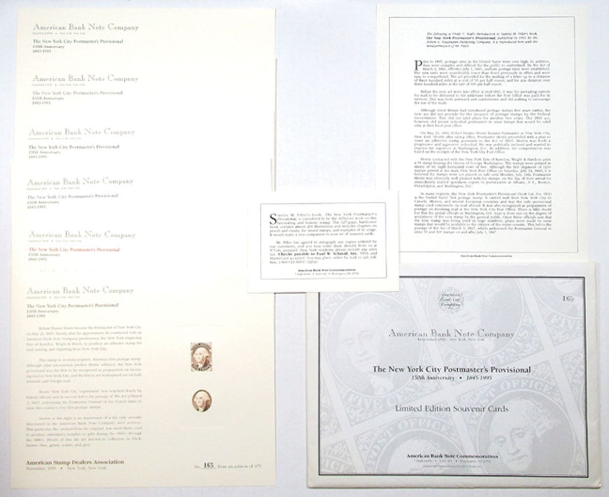 ABNC.., New York City Postmaster's Provisional Souvenir Cards from the March, June, July, August, September, and November 1995 Shows. All certificates show the 5 cent stamp of George Washington but in different colors with the matching vignette. Lot comes in original envelop with brief description on cards and ABNC certification on back. All with matching number Set #165 out of 475 sets printed. Mint condition. 6 pieces plus envelope.