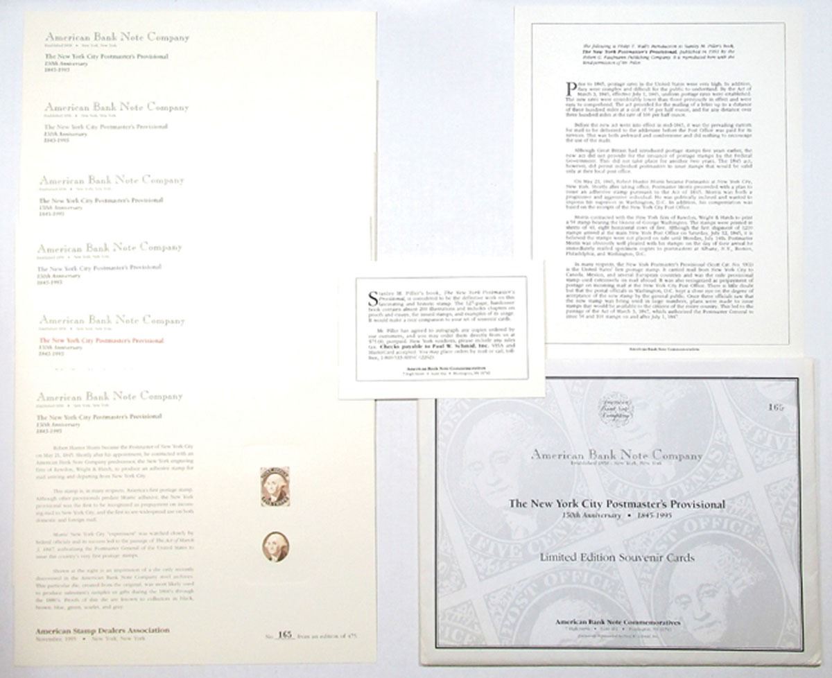 ABNC, New York City Postmaster's Provisional Souvenir Cards from the March, June, July, August, September, and November 1995 Shows. All certificates show the 5 cent stamp of George Washington but in different colors with the matching vignette. Lot comes in original envelop with brief description on cards and ABNC certification on back. All with matching number Set #165 out of 475 sets printed. Mint condition. 6 pieces plus envelope.