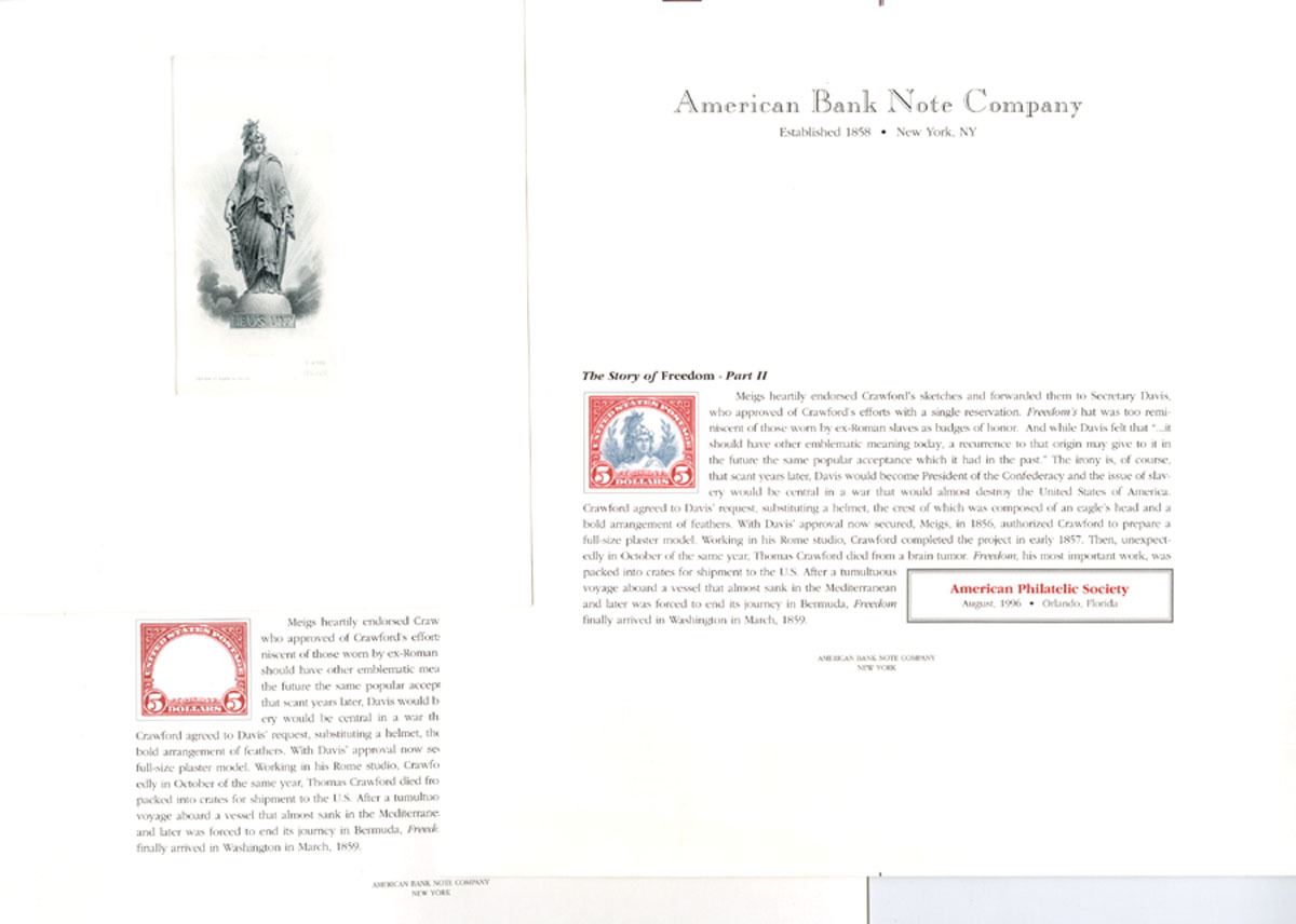 Orlando..., Florida, 1996. Lot of 3 Items, Includes 2 Progress Proofs "Story of Freedom - Part II", One is missing intaglio image and the back attestation, but includes the Litho stamp border image for the $5, 1923 Series stamp, Lot also includes vignette of "Freedom" printed on cardstock. Certificates are in Uncirculated to CU condition. (3). Sold "AS IS" no returns accepted.
