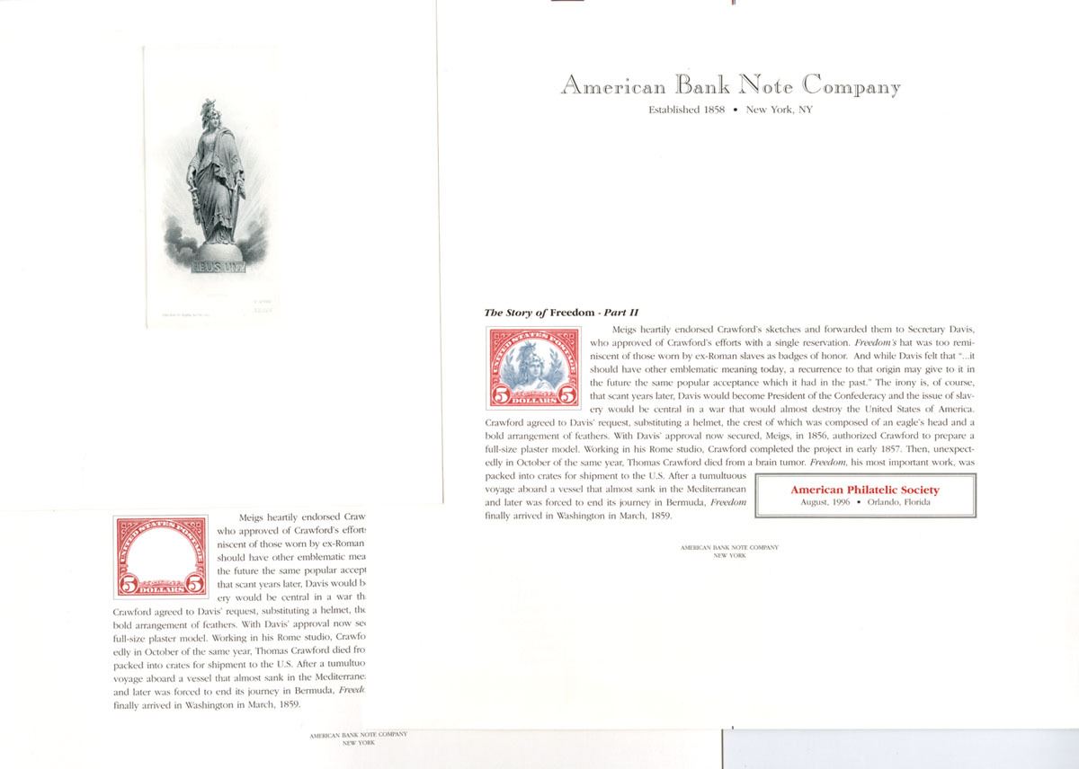 Orlando..., Florida, 1996. Lot of 3 Items, Includes 2 Progress Proofs "Story of Freedom - Part II", One is missing intaglio image and the back attestation, but includes the Litho stamp border image for the $5, 1923 Series stamp, Lot also includes vignette of "Freedom" printed on cardstock. Certificates are in XF to AU condition. (3). Sold "AS IS" no returns accepted.