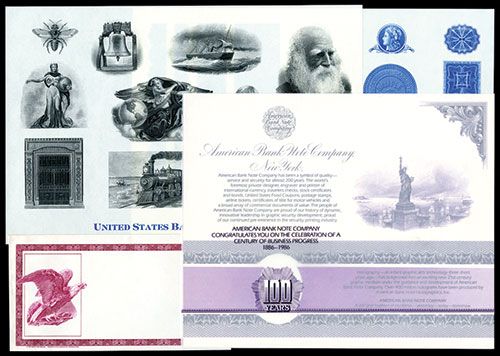 1986, 100 Years American Banknote Co. Promotional package, Includes various vignette sheets and envelopes in an assortment of colors, VF-XF condition, ABNC.