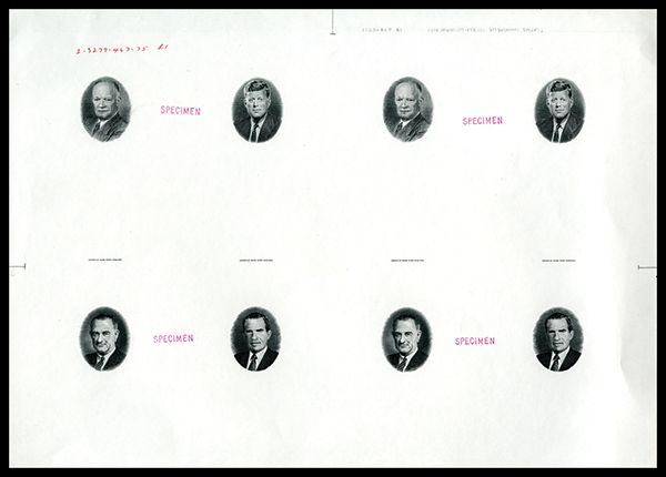 ABNC Proof Vignette sheet of 2 Blocks of 4 Different Modern Presidents. NY. ND (ca.1970's), Portraits of Eisenhower, Kennedy, Johnson and Nixon in 2 blocks of 4 different portraits. The imprint on the plate has printed in reverse "Longine Symphonette Society - Presidential Vigs" and plate number. Evidently this was some sort of gift or premium of Longines. Specimen overprints and ABN imprints below portraits, printed on thin white card. AU to Uncirculated. ABNC. Scarce.