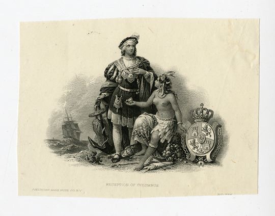 Spain & New York, ND (1870s). Proof Vignette used on Banco de Espana 1000 Pesetas, P-13, Vignettes shows Columbus beside a bare breasted women with seal of Spain beside her, "Reception of Columbus - American Bank Note Co. N.Y. - No. 779 (cut close)" Imprint, AU to Uncirculated condition.