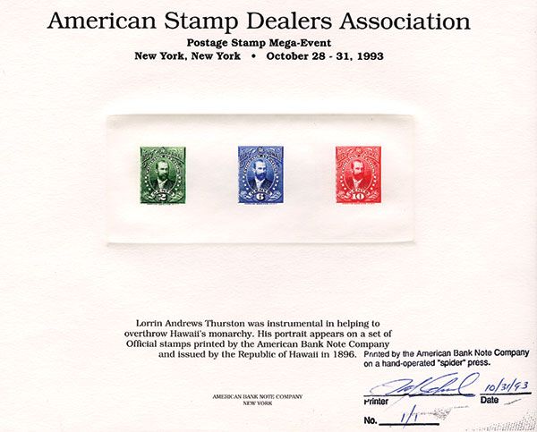 3 Different Republic of Hawaii, Department of Foreign Affairs Revenue Stamp proofs, 2 Cents; 6 Cents and 10 Cents, Signed on Front of the card by the Spider Press operator on 10/31/1993 at the A.S.D. A. New York show, Barr- SO/122 “3 Hawaii Official Stamps”. Mint, ABNC.