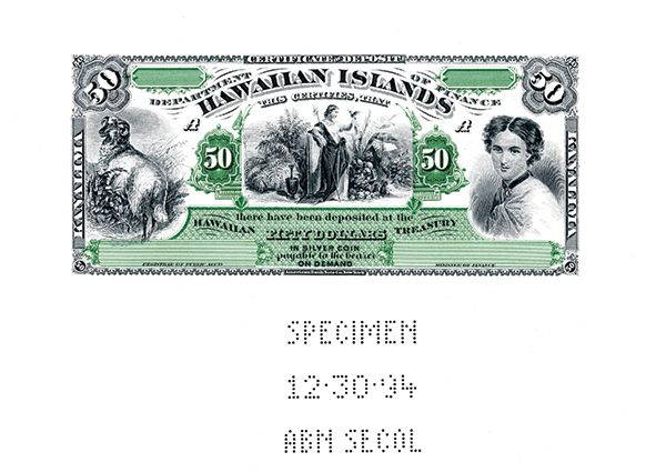 ABNC Souvenir Card Specimen Kingdom of Hawaii 1879 $50 Silver Certificate of Deposit Intaglio Reprint ca.1970-80's reprint, Pin-Punch Specimen with date 12-30-94, ABNC Endorsement on back. One of 3 Specimens of this denomination found. Mint Condition. Beautiful.