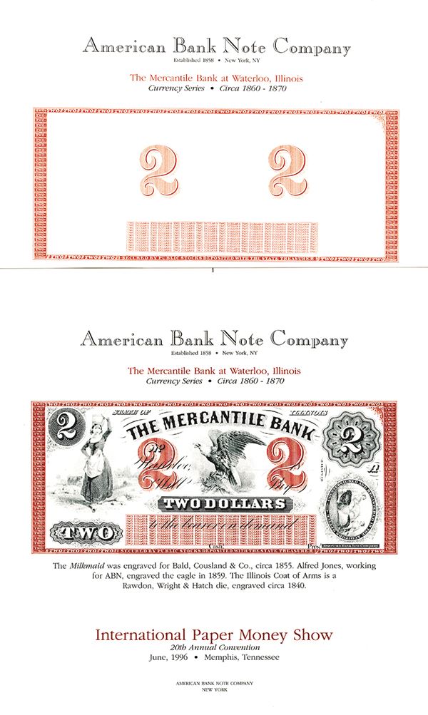 Memphis, TN, With $2 Mercantile Bank Waterloo, IL. Obsolete Note. Lot of 2 cards, Both are International Paper Money Show, 20th Convention, June 1996, Memphis, TN, $2 Mercantile Bank, Waterloo, IL. Barr- SO/156 Unlisted. One has complete note and the second frame only. Mint, ABNC.