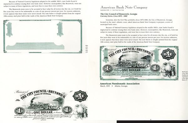 ANA, 1995, Atlanta, GA, Progress proofsæwith $1æUncut SheetæCity Council of Brunswick of complete note with green frame and underprint and black text and vignette; The vignette only in black and the complete card with only the frame, no vignette, Barr-æSO/144. Mint. ABNC. (3)