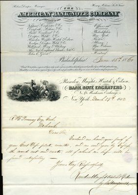 1852, 1860. 2 different early security printer letterheads. 1). RWH&E postmarked and stampless cover letterhead dated 1852 with vignette of allegorical neptune with U.S. Liberty in chariot pulled by seahorses; 2). The American BNC early letterhead from 1860 with list of all of the companies that joined to form it. Both in VF condition.