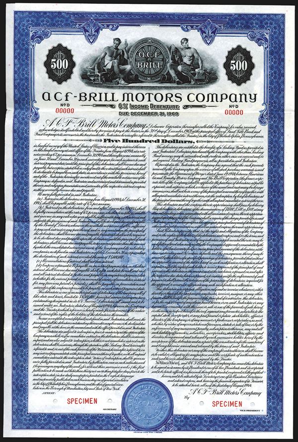 Delaware, 1944, $500, 6% Income Specimen Coupon Bond, Black on blue border and underprint, Allegorical men flanking company logo top center, POC's, VF condition, ABNC.