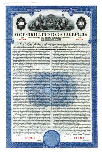 Delaware, 1944, $500, 6% Income Specimen Coupon Bond, Black on Blue border and underprint, Allegorical men flanking company logo top center, POC's, VF condition, ABNC. Well known for bus and truck manufacturing.