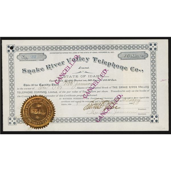173 - Snake River Valley Telephone Co., Ltd., 1899 I/C Stock Certificate.Archives International Auctions