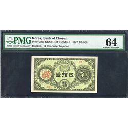 Korea. 50 Sen, P-27, K&C51.15F / DK33-1, Issued banknote, Block 3, 12 character imprint, black on green underprint, PMG graded Choice Uncirculat...