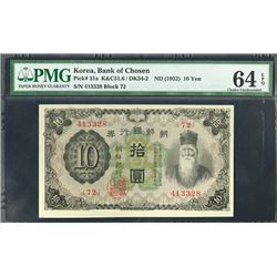 Korea. 10 Sen, P-20, K&C51.15B / DK31-3, Issued banknote, Block 2, blue on pink underprint, PMG graded Gem Uncirculated 65 EPQ. Scarce in high g...