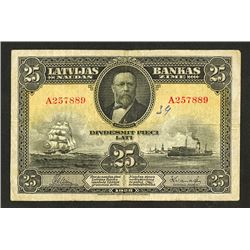 Latvia. 25 Lati. P-18a. Valdemars portrait at top center, sailing and steam ships at lower left and right. VF, Ink graffiti.