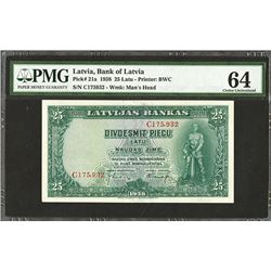 Latvia, 25 Latu, P-21a, issued, Green, National hero Lacplesis at right, back with raft, PMG graded Choice Uncirculated 64, BWC. Rarely seen this nice