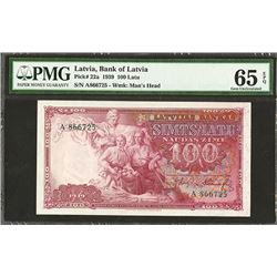 Latvia, 100 Latu, P-22a, issued, red, Farm couple and family, back red, PMG graded Gem Uncirculated 65 EPQ, Attractive note rarely seen this nice.