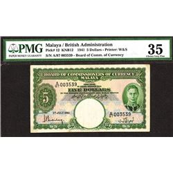 Malaya, 1st July, 1941, $5, P-12, KNB12, Issued banknote, Green on m/c, King George VI on Right, back green, S/N A/87 003539, PMG graded Choice Very F