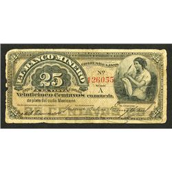 Chihuahua, Mexico. 1888, 25 Centavos, Series A, P-S160a, Issued banknote, face is black on light brown underprint with allegorical woman with quill an