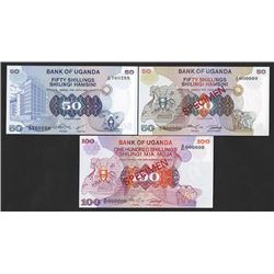Uganda, Lot of 3 notes, Includes, 1979, 50 Shillings, P-13a, Issued, Light printing on bank, CU; , 50 Shillings, P-18bs and 19bs, both Unlisted Speci