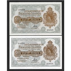 Falkland Islands. Lot of 2 notes, 50 pence. P-10b (2). 20.2.1974. Elizabeth II at right. Bold watermark. Both are Choice to Gem Uncirculated. 2 pieces