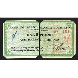 Fanning Island. 1 Pound note cut in half, then corners cut, left side in blue crayon pencil marked 1/-, right side marked 2/- (One Shilling and Two sh