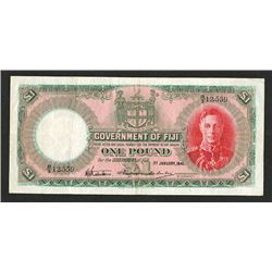 Fiji, £1, P-40a, Issued, Green on red and pink, King George VI at right, S/N B/3 12,559. VF to Choice VF with bright colors, sharp corners and ...