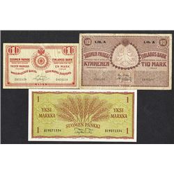 Finland. 1, 10 Mark. P-16, 25, 98. Two nice early notes, the third nice and modern. VF to AU. 3 pieces.