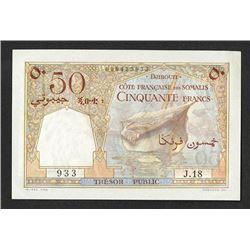 French Somaliland, 50 Francs, P-25, Issued, light brown on m/c, ship at right, back with camel caravan, S/N 933-J.18, Uncirculated to CU. Attractive n