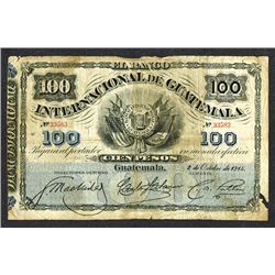 Guatemala. 100 Pesos. P-S159a. 2.10.1914. Fine or a bit better. Light stains and paper loss at bottom right edge.