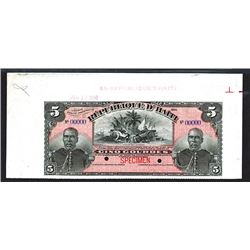 Haiti, Treasury. Loi Du 14 Mai 1908. 1908. 5 Gourdes, P-125s. Specimen banknote. No Ser. Specimen banknote. Red specimen overprint, POC and blue &qu...